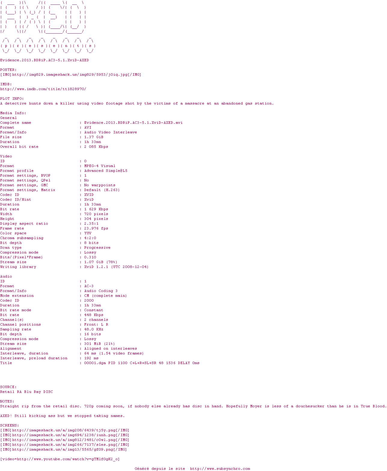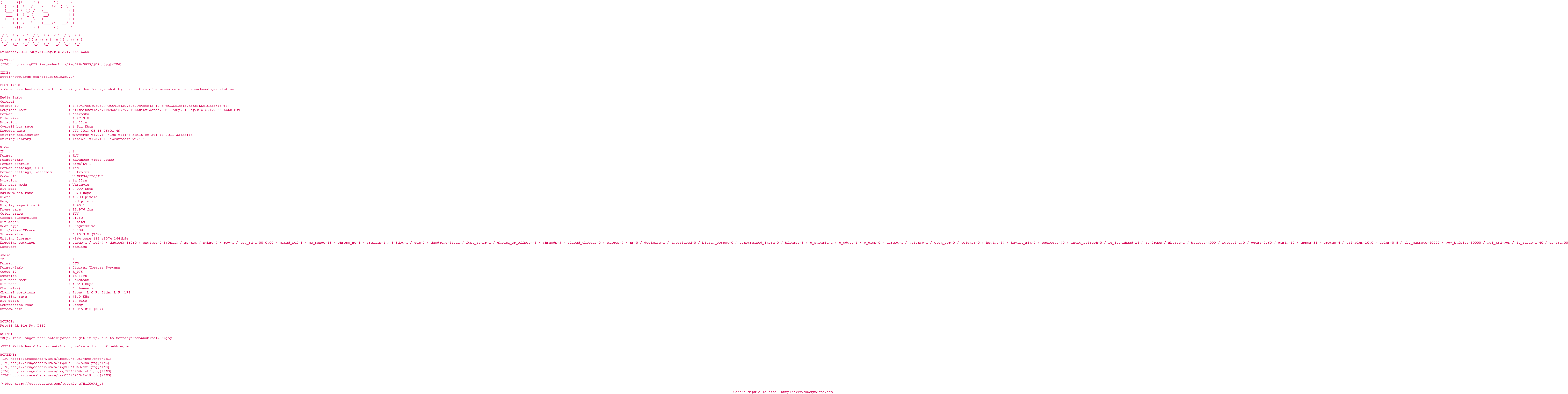 Voir le nfo de la release Evidence.2013.720p.BluRay.DTS-5.1.x264-AXED