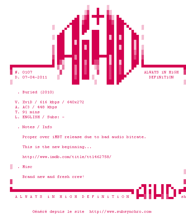 Voir le nfo de la release Buried.2010.PROPER.BDRip.XviD-AiHD