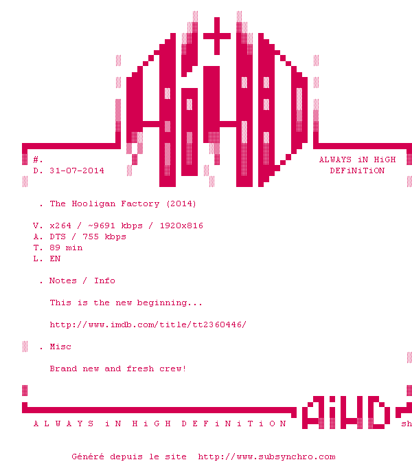 Voir le nfo de la release The.Hooligan.Factory.2014.1080p.BluRay.x264-AiHD