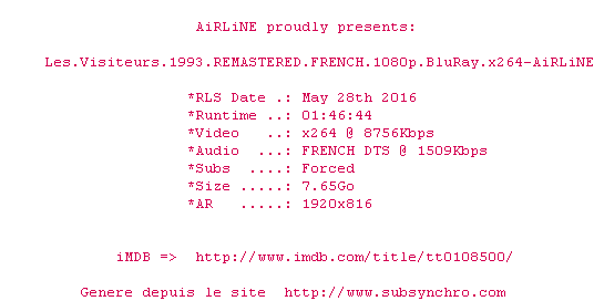 Voir le nfo de la release Le.Huitieme.Jour.1996.FRENCH.1080p.BluRay.x264-AiRLiNE