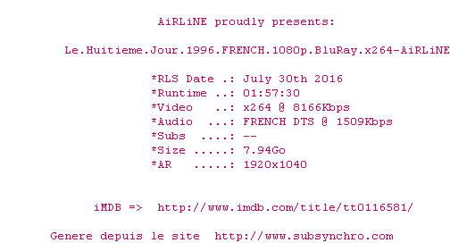 Voir le nfo de la release Le.Huitieme.Jour.1996.FRENCH.720p.BluRay.x264-AiRLiNE