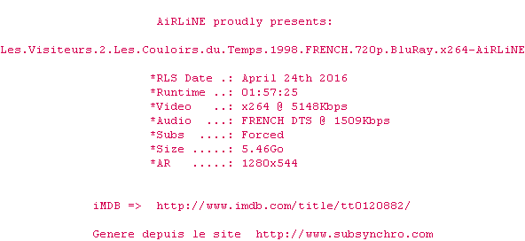 Voir le nfo de la release OSS.117.Le.Caire.Nid.D.Espions.2006.FRENCH.1080p.BluRay.x264-AiRLiNE