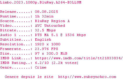 Voir le nfo de la release Limbo.2023.1080p.BluRay.H264-B3LLUM
