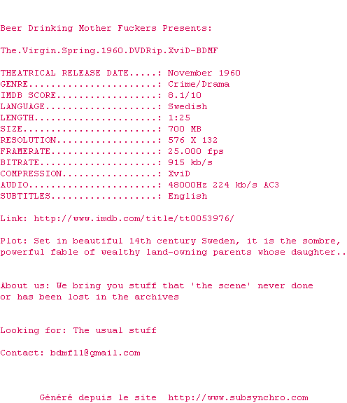 Voir le nfo de la release The.Virgin.Spring.1960.DVDRip.XviD-BDMF
