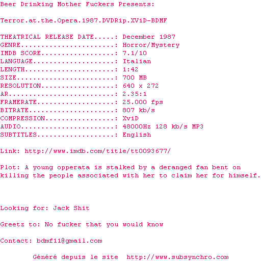 Voir le nfo de la release Terror.At.The.Opera.1987.DVDRip.XViD-BDMF