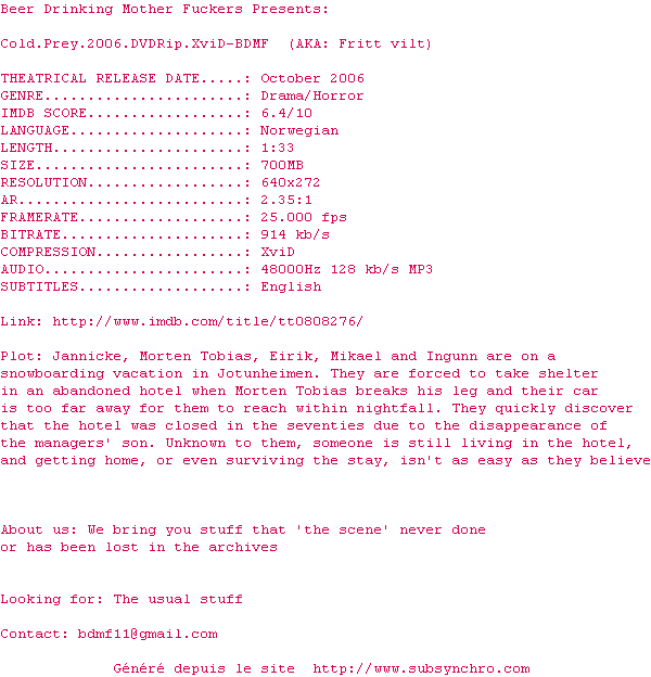 Voir le nfo de la release Cold.Prey.2006.DVDRip.XviD-BDMF