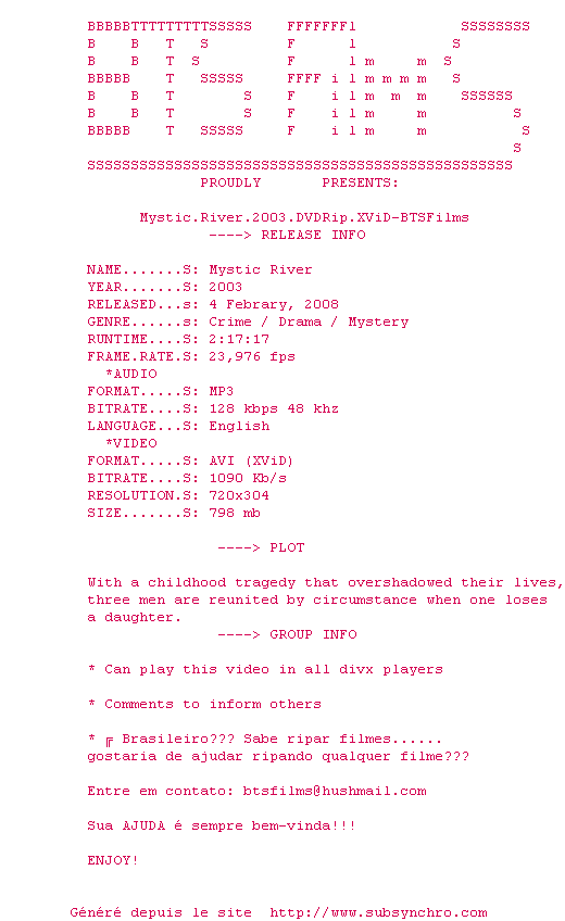 Voir le nfo de la release Mystic.River.2003.DVDRip.XViD-BTSFilms