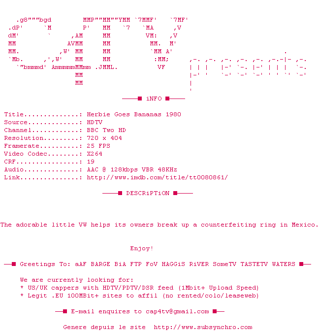 Voir le nfo de la release Herbie.Goes.Bananas.1980.HDTV.x264-C4TV
