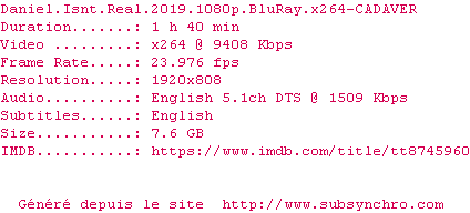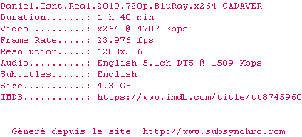 Voir le nfo de la release Daniel.Isnt.Real.2019.1080p.BluRay.x264-CADAVER