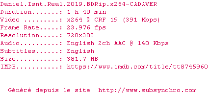 Voir le nfo de la release Daniel.Isnt.Real.2019.BDRip.x264-CADAVER