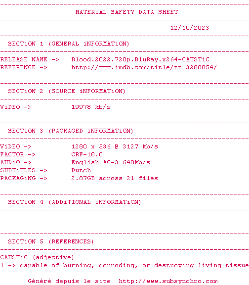 Voir le nfo de la release Blood.2022.720p.BluRay.x264-CAUSTiC