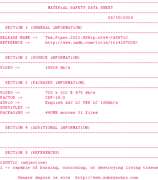 Voir le nfo de la release The.Piper.2023.BDRip.x264-CAUSTiC