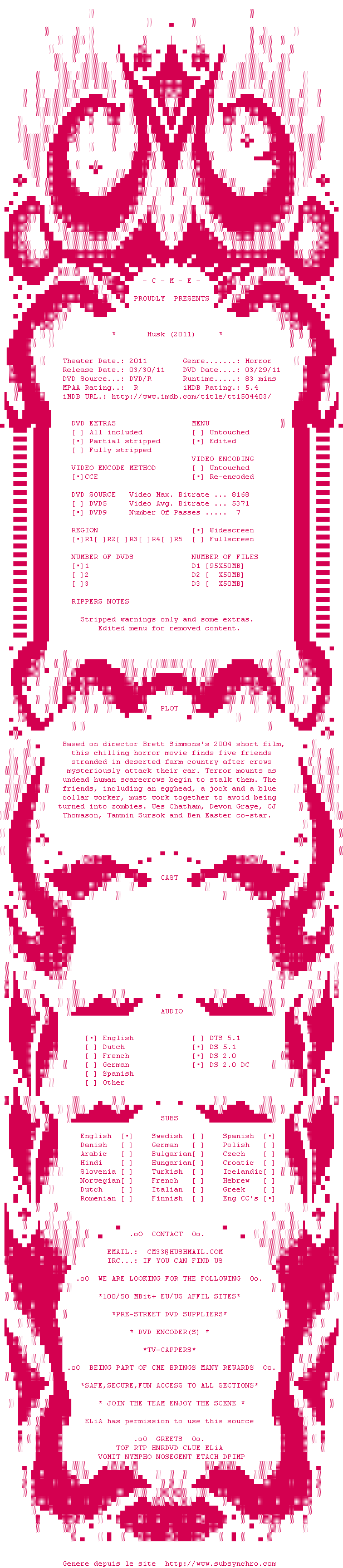 Voir le nfo de la release Husk.2011.R1.NTSC.DVDR-CME