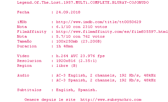Voir le nfo de la release Legend.Of.The.Lost.1957.MULTi.COMPLETE.BLURAY-COJONUDO