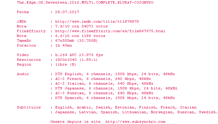 Voir le nfo de la release The.Edge.Of.Seventeen.2016.MULTi.COMPLETE.BLURAY-COJONUDO