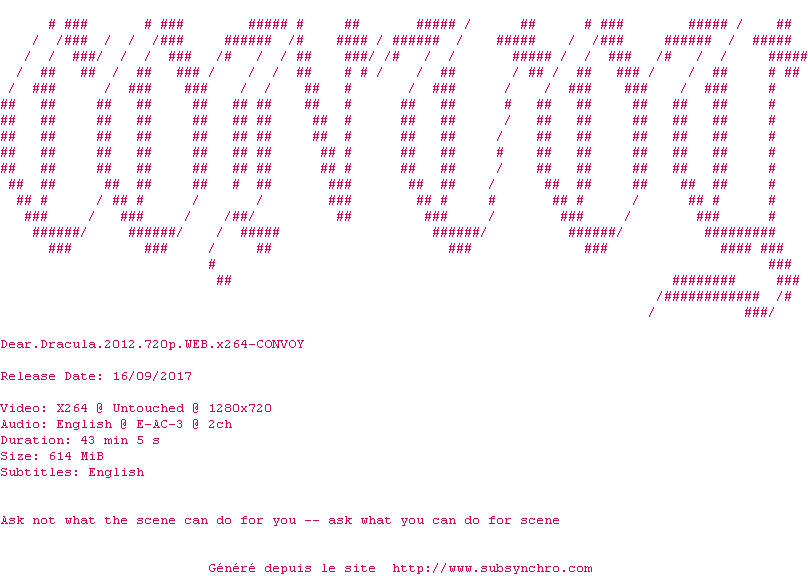 Voir le nfo de la release Dear.Dracula.2012.720p.WEB.x264-CONVOY