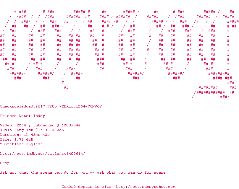 Voir le nfo de la release Unacknowledged.2017.720p.WEBRip.x264-CONVOY