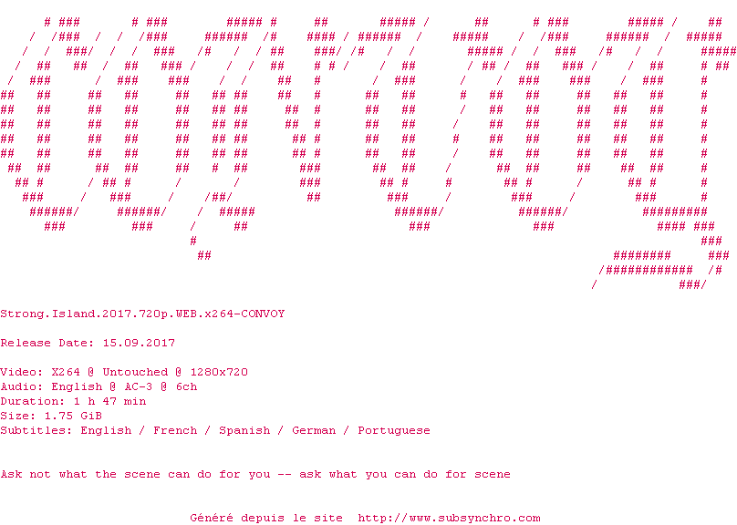 Voir le nfo de la release Strong.Island.2017.720p.WEB.x264-CONVOY
