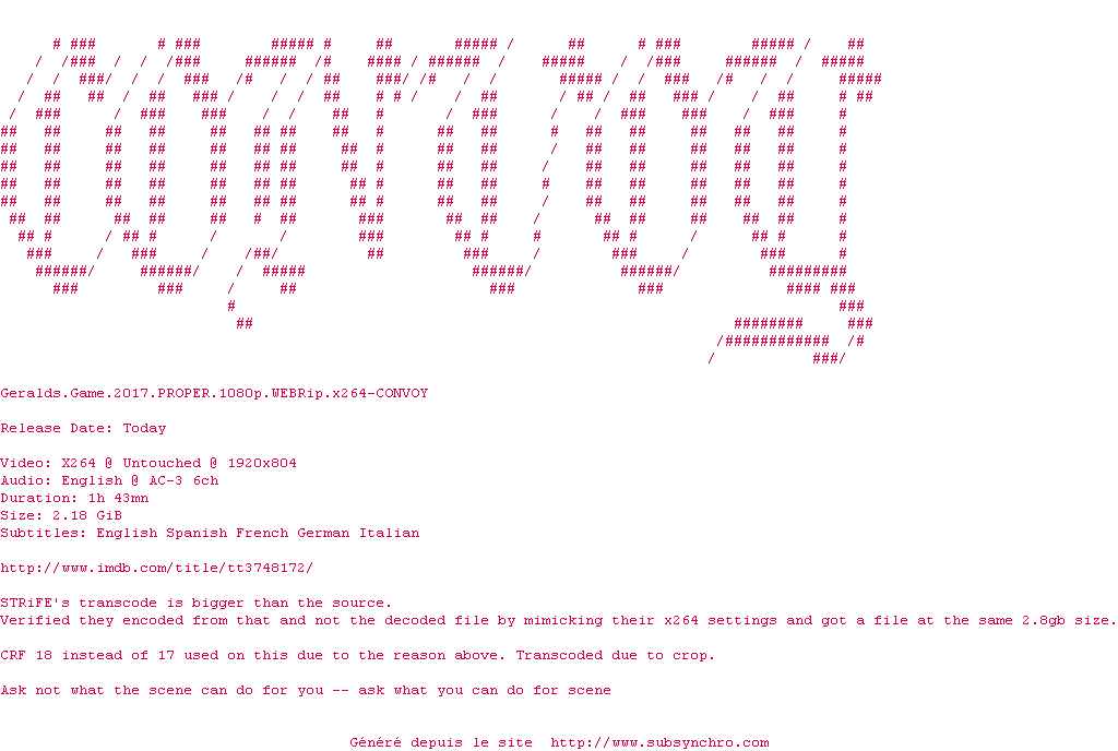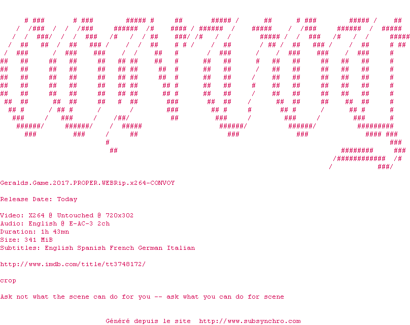 Voir le nfo de la release Geralds.Game.2017.PROPER.WEBRip.x264-CONVOY