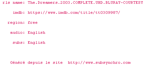 Voir le nfo de la release The.Dreamers.2003.COMPLETE.UHD.BLURAY-COURTESY