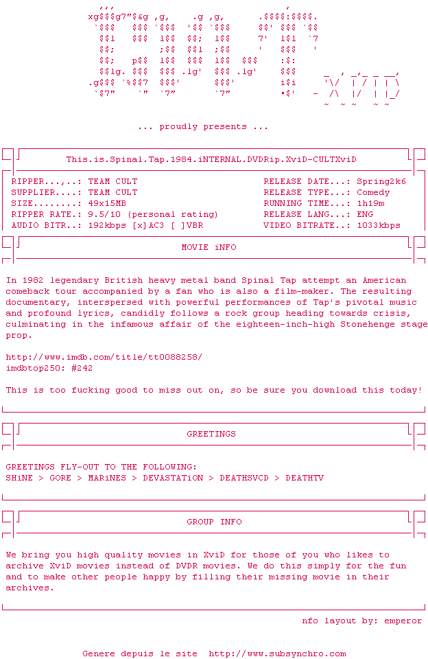 Voir le nfo de la release This.Is.Spinal.Tap.1984.iNTERNAL.DVDRip.XviD-CULTXviD