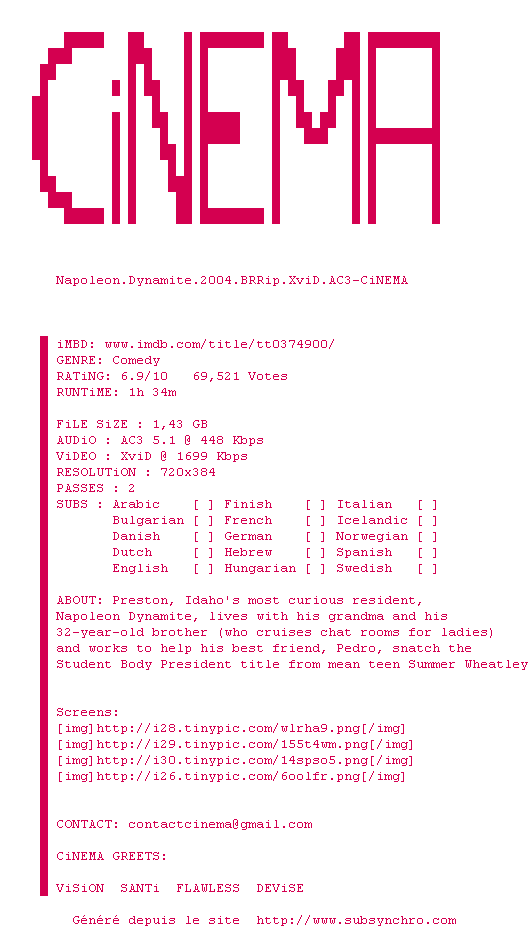 Voir le nfo de la release Napoleon.Dynamite.2004.BRRip.XviD.AC3-CiNEMA