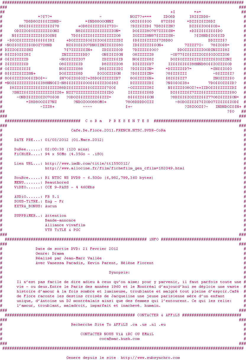 Voir le nfo de la release Cafe.De.Flore.2011.FRENCH.NTSC.DVDR-CoRa