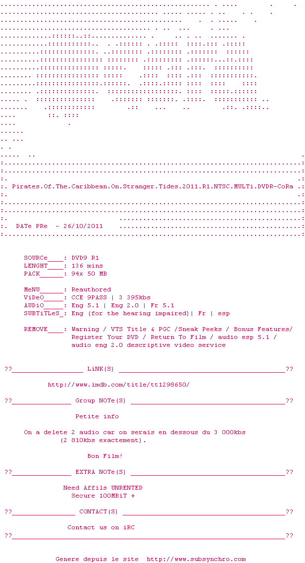 Voir le nfo de la release Pirates.Of.The.Caribbean.On.Stranger.Tides.2011.R1.NTSC.MULTi.DVDR-CoRa