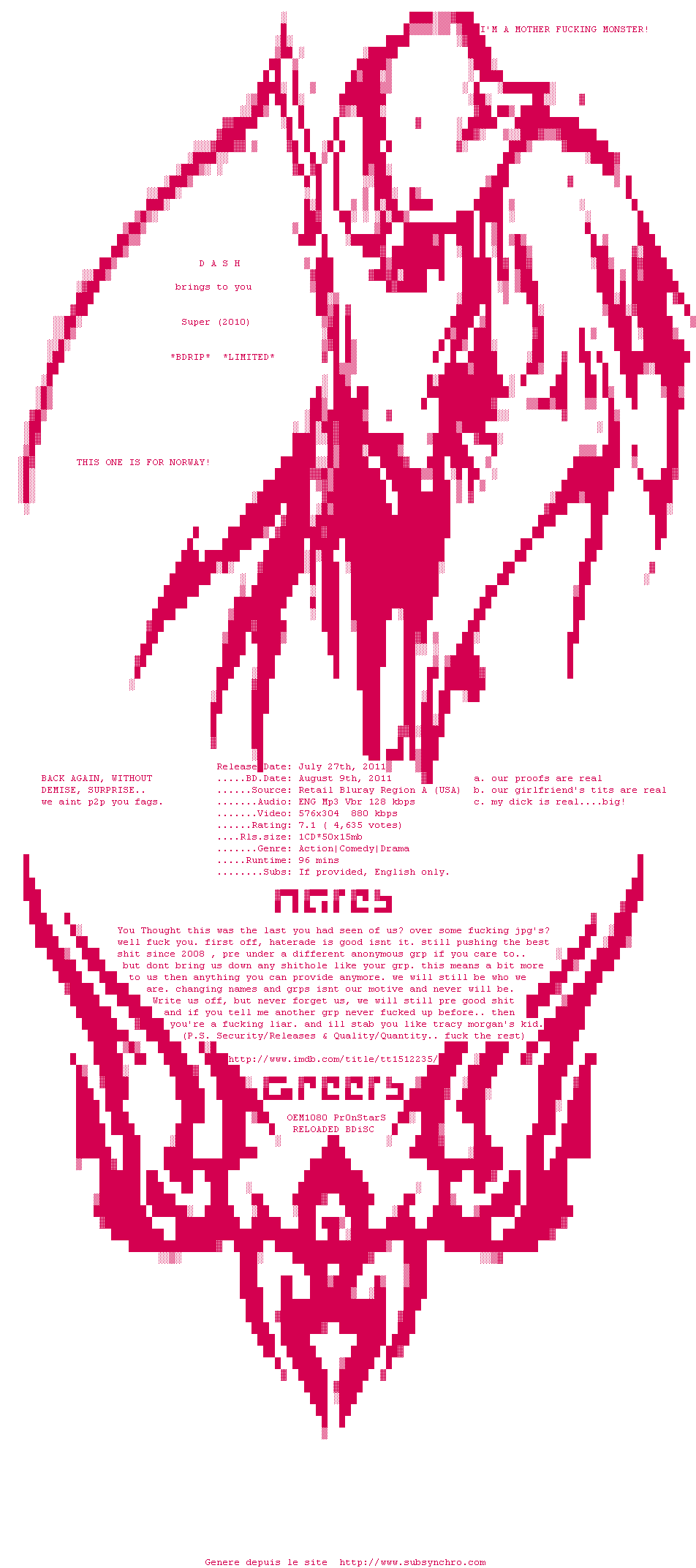 Voir le nfo de la release Super.2010.LiMiTED.BDRip.XviD-DASH