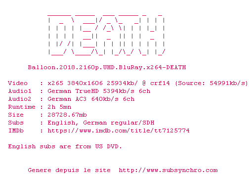 Voir le nfo de la release Balloon.2018.2160p.UHD.BluRay.x265-DEATH