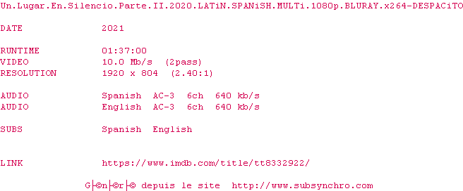 Voir le nfo de la release Un.Lugar.En.Silencio.Parte.II.2020.LATiN.SPANiSH.MULTi.1080p.BLURAY.x264-DESPACiTO