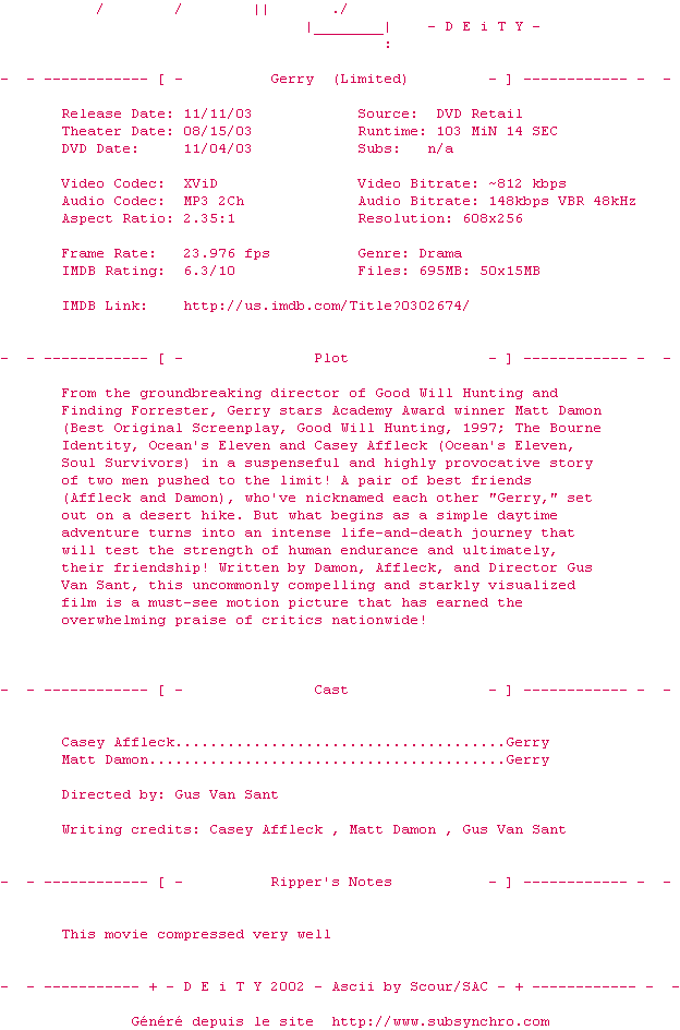 Voir le nfo de la release Gerry.2002.DVDRip.XviD-DEiTY