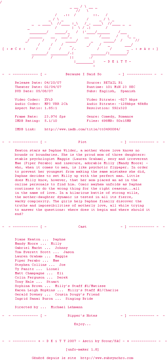 Voir le nfo de la release Because.I.Said.So.DVDRiP.XViD-DEiTY