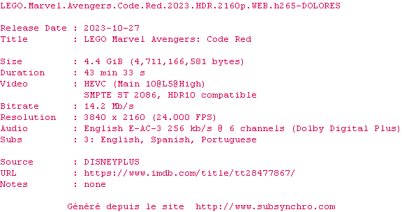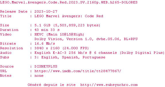 Voir le nfo de la release LEGO.Marvel.Avengers.Code.Red.2023.HDR.2160p.WEB.H265-DOLORES