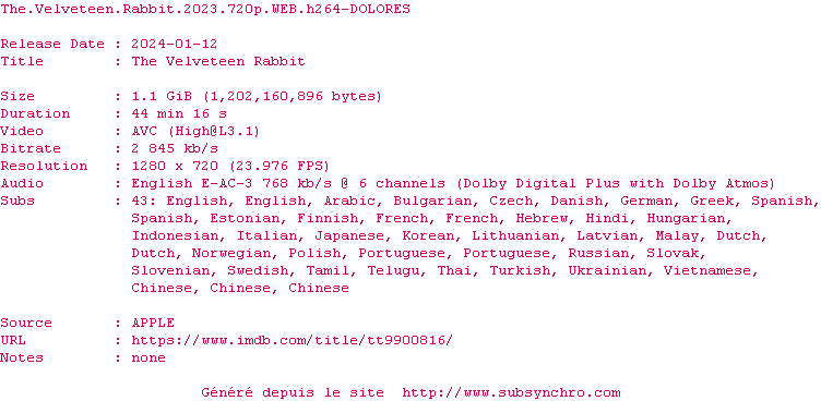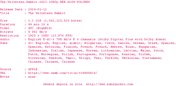 Voir le nfo de la release The.Velveteen.Rabbit.2023.1080p.WEB.H264-DOLORES