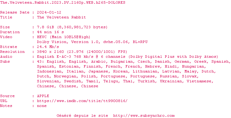 Voir le nfo de la release The.Velveteen.Rabbit.2023.DV.2160p.WEB.H265-DOLORES