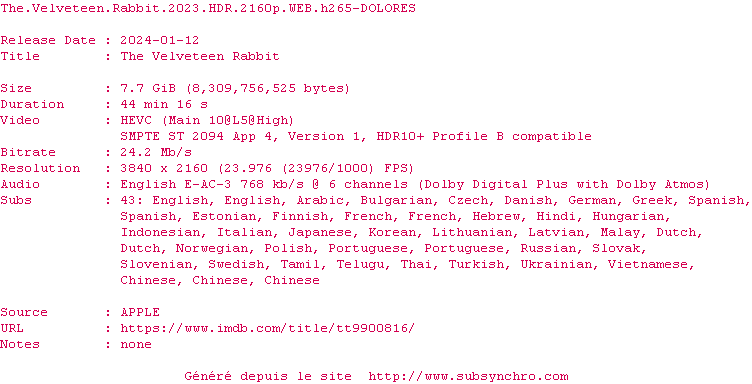 Voir le nfo de la release The.Velveteen.Rabbit.2023.HDR.2160p.WEB.H265-DOLORES