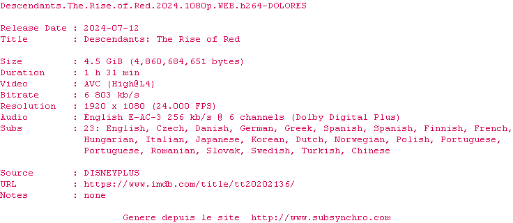 Voir le nfo de la release Descendants.The.Rise.Of.Red.2024.HDR.2160p.WEB.H265-DOLORES