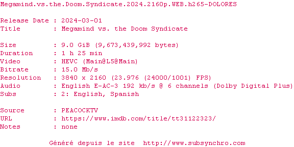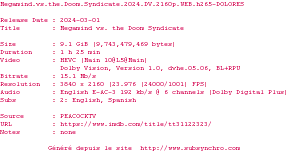 Voir le nfo de la release Megamind.Vs.The.Doom.Syndicate.2024.2160p.WEB.H265-DOLORES