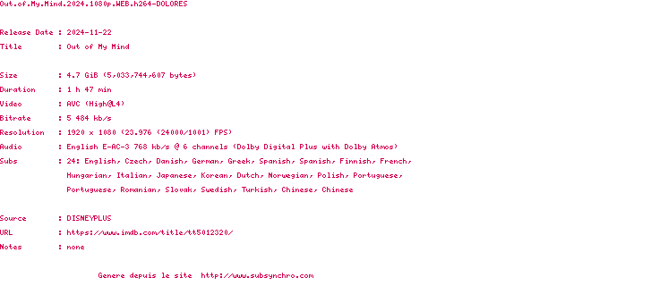 Voir le nfo de la release Out.Of.My.Mind.2024.1080p.WEB.H264-DOLORES