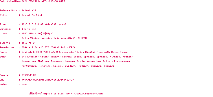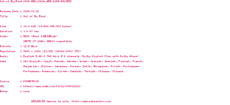 Voir le nfo de la release Out.Of.My.Mind.2024.HDR.2160p.WEB.H265-DOLORES