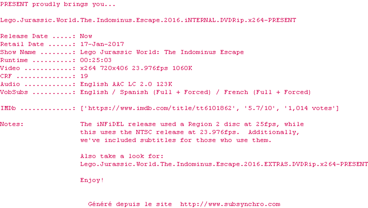 Voir le nfo de la release Lego.Jurassic.World.The.Indominus.Escape.2016.iNTERNAL-DVDRip