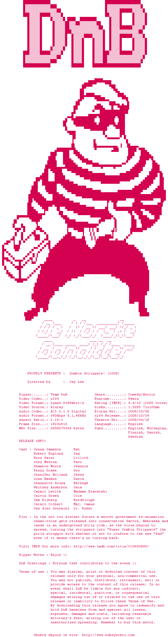 Voir le nfo de la release Zombie.Strippers.2008.LiMiTED.1080p.BluRay.x264-DnB