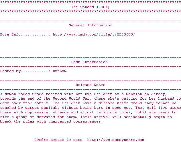 Voir le nfo de la release The.Others.2001.Xvid-Durham