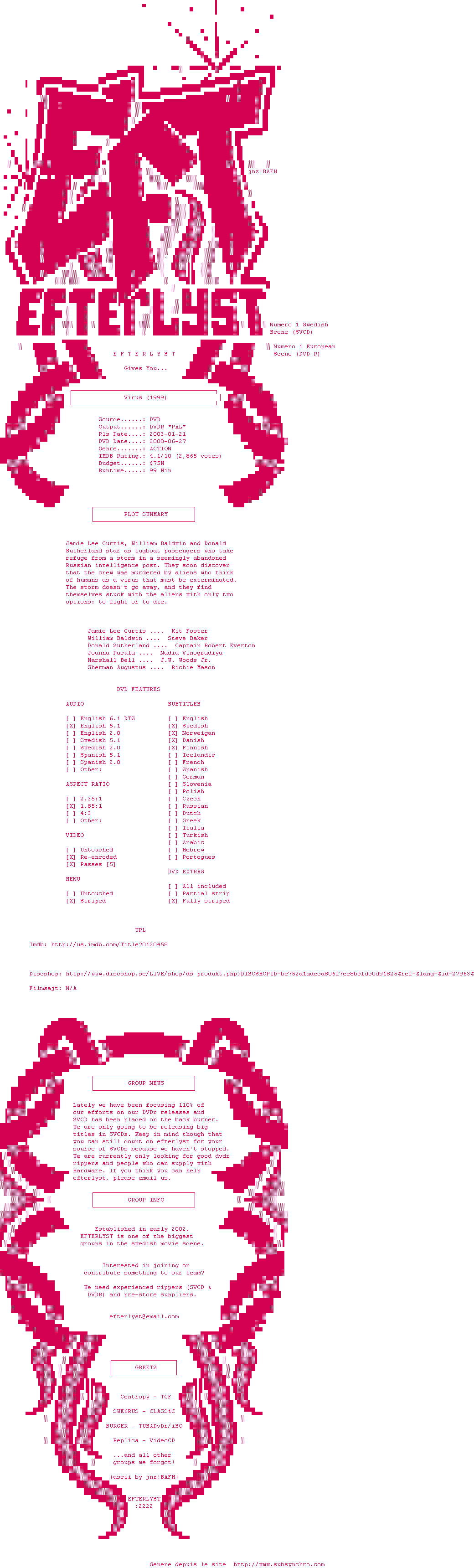 Voir le nfo de la release Virus.1999.PAL.DVDR-EFTERLYST