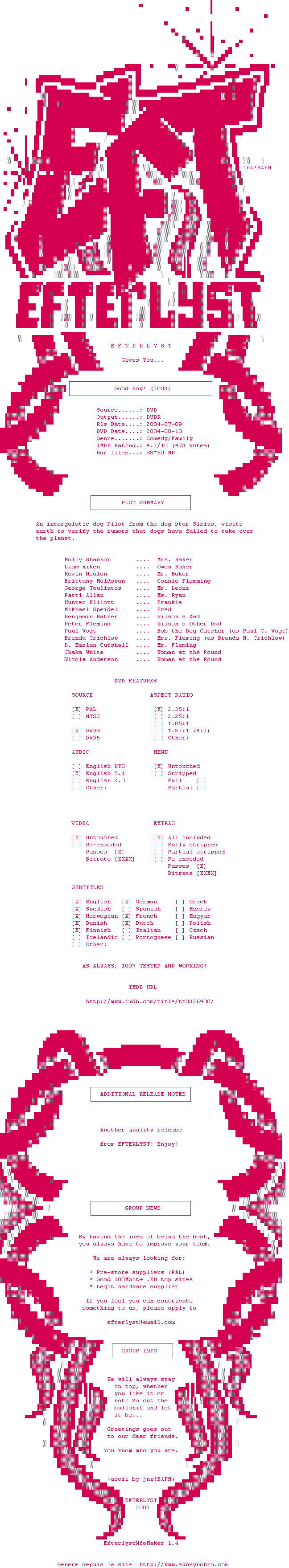 Voir le nfo de la release Good.Boy.2003.NORDIC.PAL.DVDR-EFTERLYST