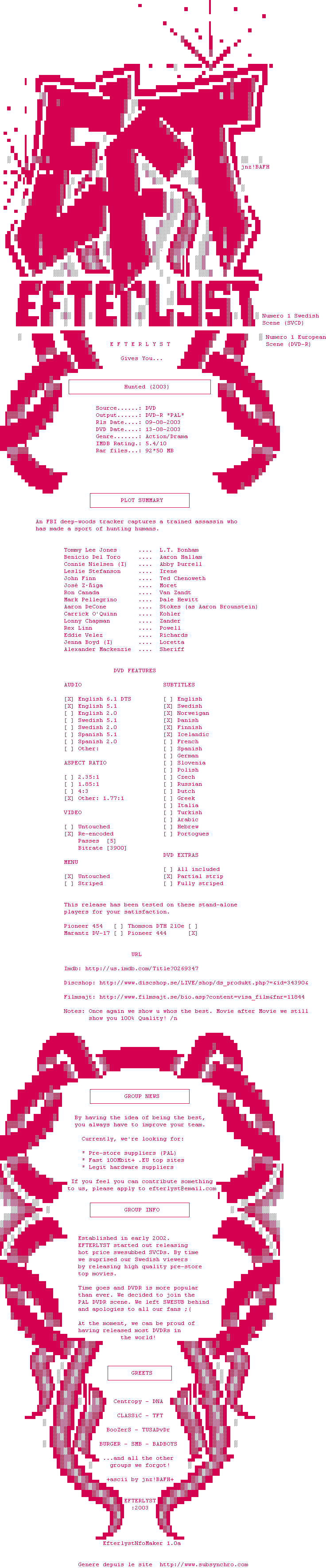 Voir le nfo de la release The.Hunted.2003.PAL.DVDR-EFTERLYST