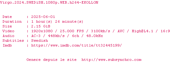 Voir le nfo de la release Virgo.2024.SWEDiSH.1080p.WEB.H264-EKOLLON