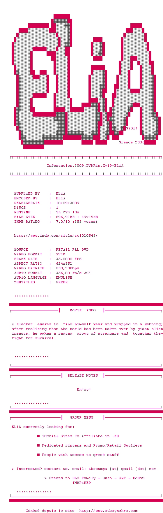 Voir le nfo de la release Infestation.2009.DVDRip.XviD-ELiA
