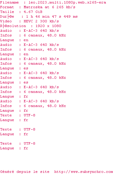 Voir le nfo de la release Leo.2023.MULTi.1080p.WEB.x265-ERA